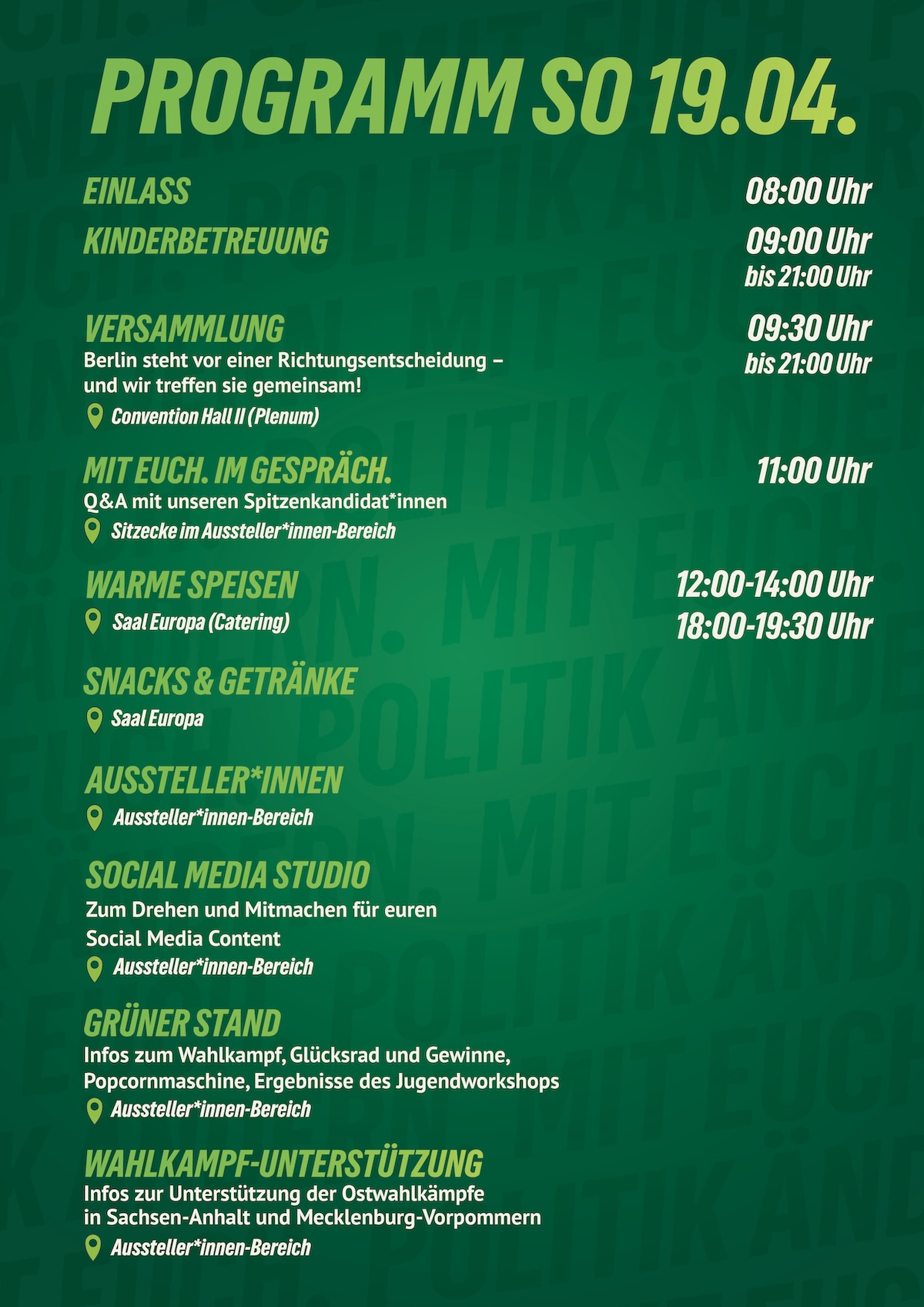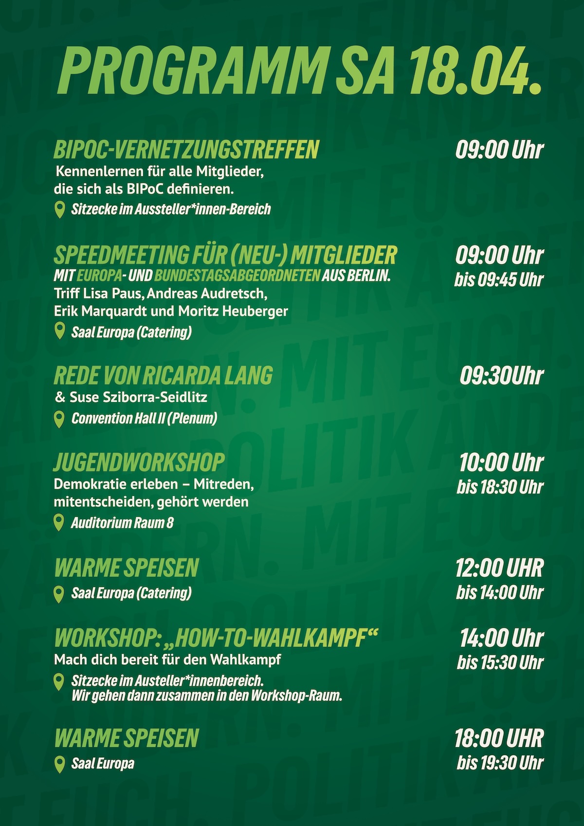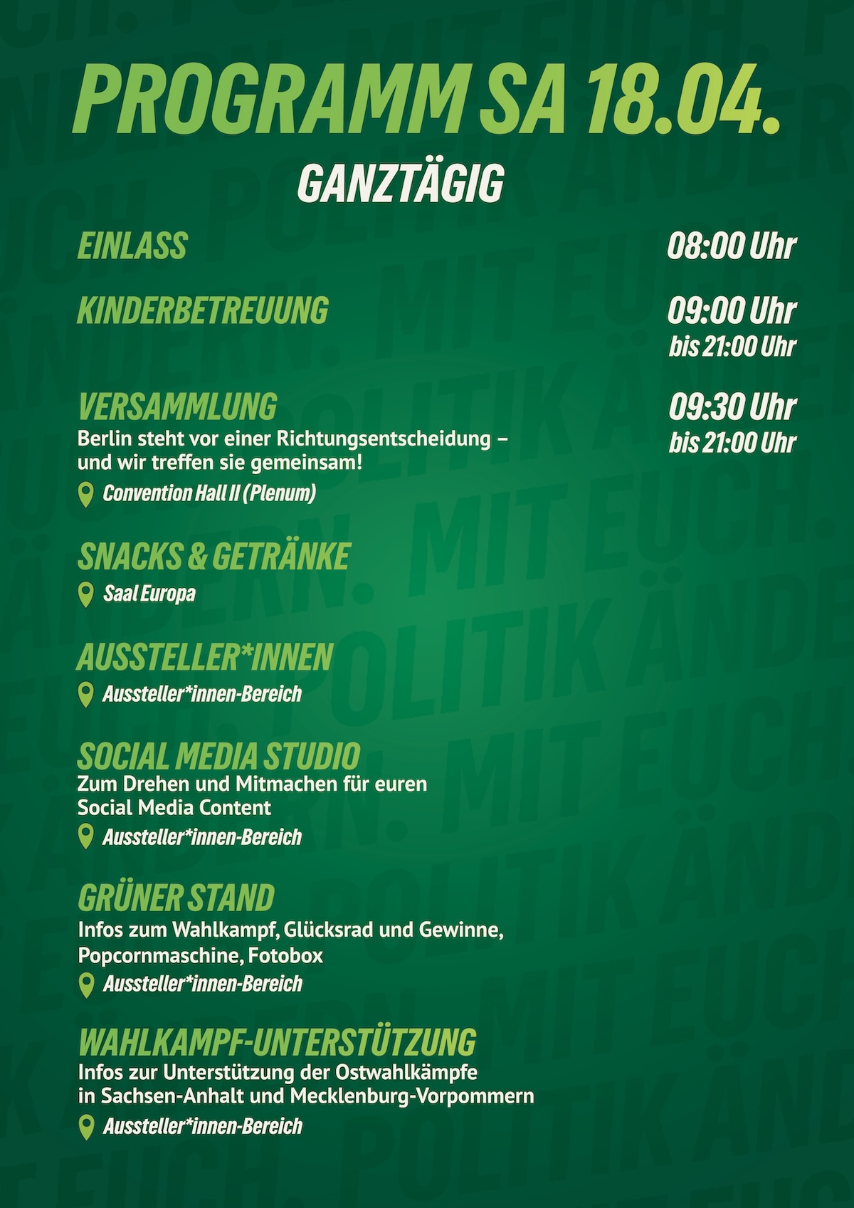 Aber auch neben den Wahlen wird die LMV ein Ort voller Energie! Es erwartet euch ein abwechslungsreiches Programm mit Raum für Debatten, inspirierende Gespräche und neue Ideen. Ihr könnt unsere Spitzenkandidat*innen treffen, euch zum Wahlkampf im Osten in Sachsen-Anhalt und Mecklenburg-Vorpommern informieren und euch interaktiv auf den Haustürwahlkampf vorbereiten. Hier seid ihr mitten im Geschehen, könnt euch vernetzen und erleben, wie Politik lebendig wird. Auf dieser Landesmitgliederversammlung wird folglich nicht nur gewählt, sondern der Grundstein für den kommenden Wahlkampf und ein grünes und gerechtes Berlin gelegt. Es lohnt sich also in jedem Fall – sei dabei und gestalte mit!